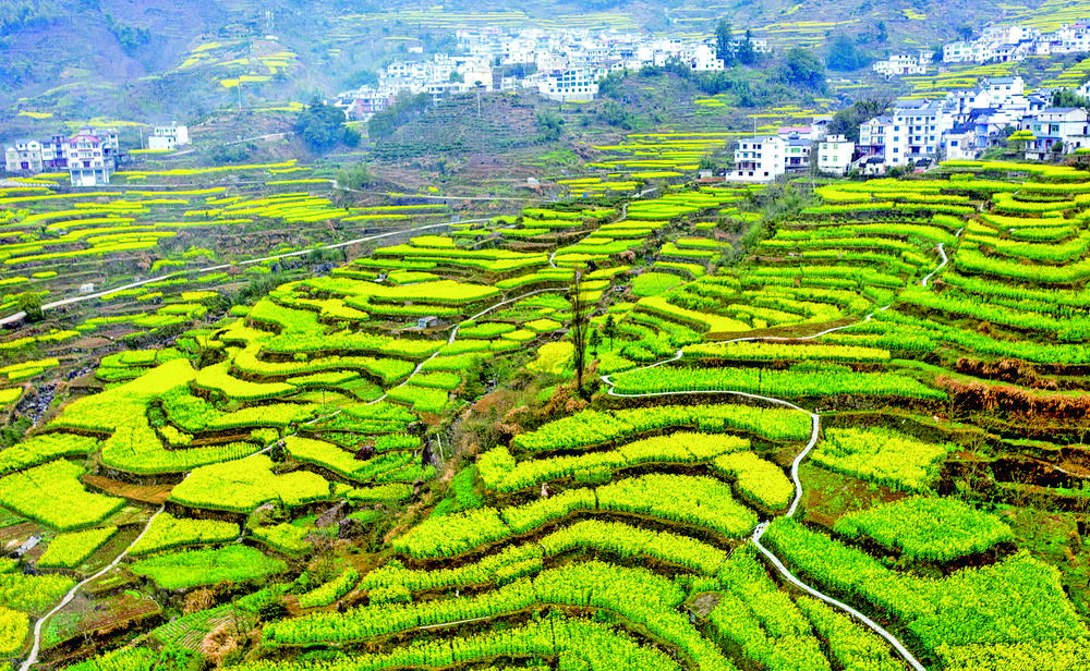 3月14日,安徽省歙县三阳镇上坦梯田,油菜花层层叠叠,春意盎然。连日来,随着气温回升,三阳镇上坦村千亩梯田中的油菜花竞相开放,田野犹如铺上了金黄色的地毯,吸引不少游客前来观光。左学长摄(中经视觉)