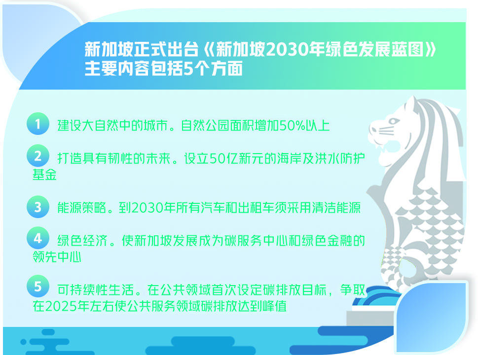 近日,新加坡着眼实现经济绿色环保可持续发展,正式出台《新加坡2030年绿色发展蓝图》,从基础设施、交通、教育、经济发展和应对气候变化等方面,阐述绿色理念,打造宜居环境,提升国家竞争力。