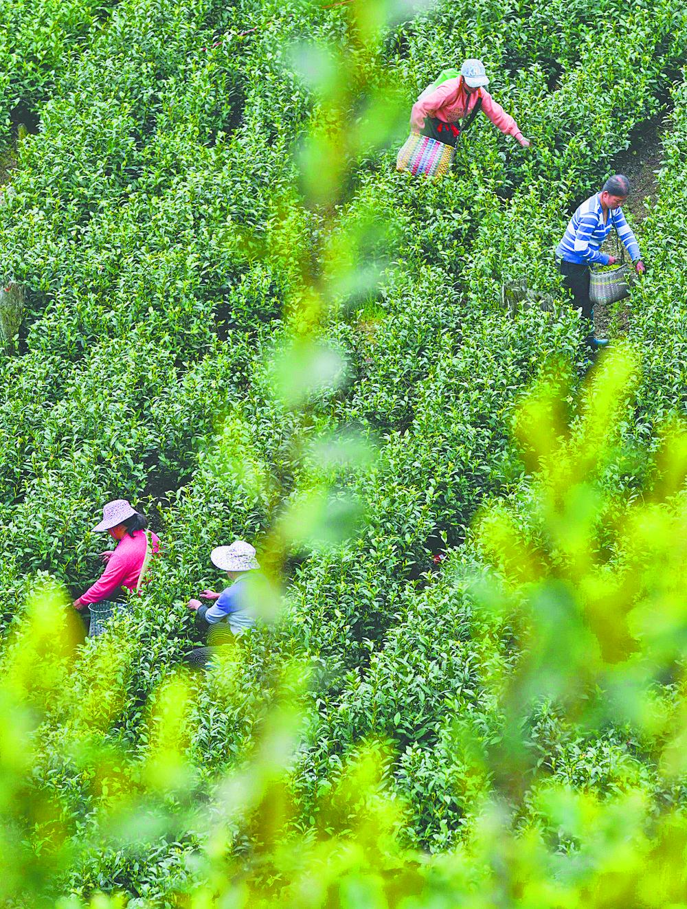 日前,在湖南省永州市江华瑶族自治县桥市乡,茶农正在采摘春茶。近年来,江华县大力盘活山地、林地发展茶叶产业,全县茶叶种植面积达7万余亩,共有茶叶加工企业48家,有力促进了农民增收。蒋克青摄(中经视觉)