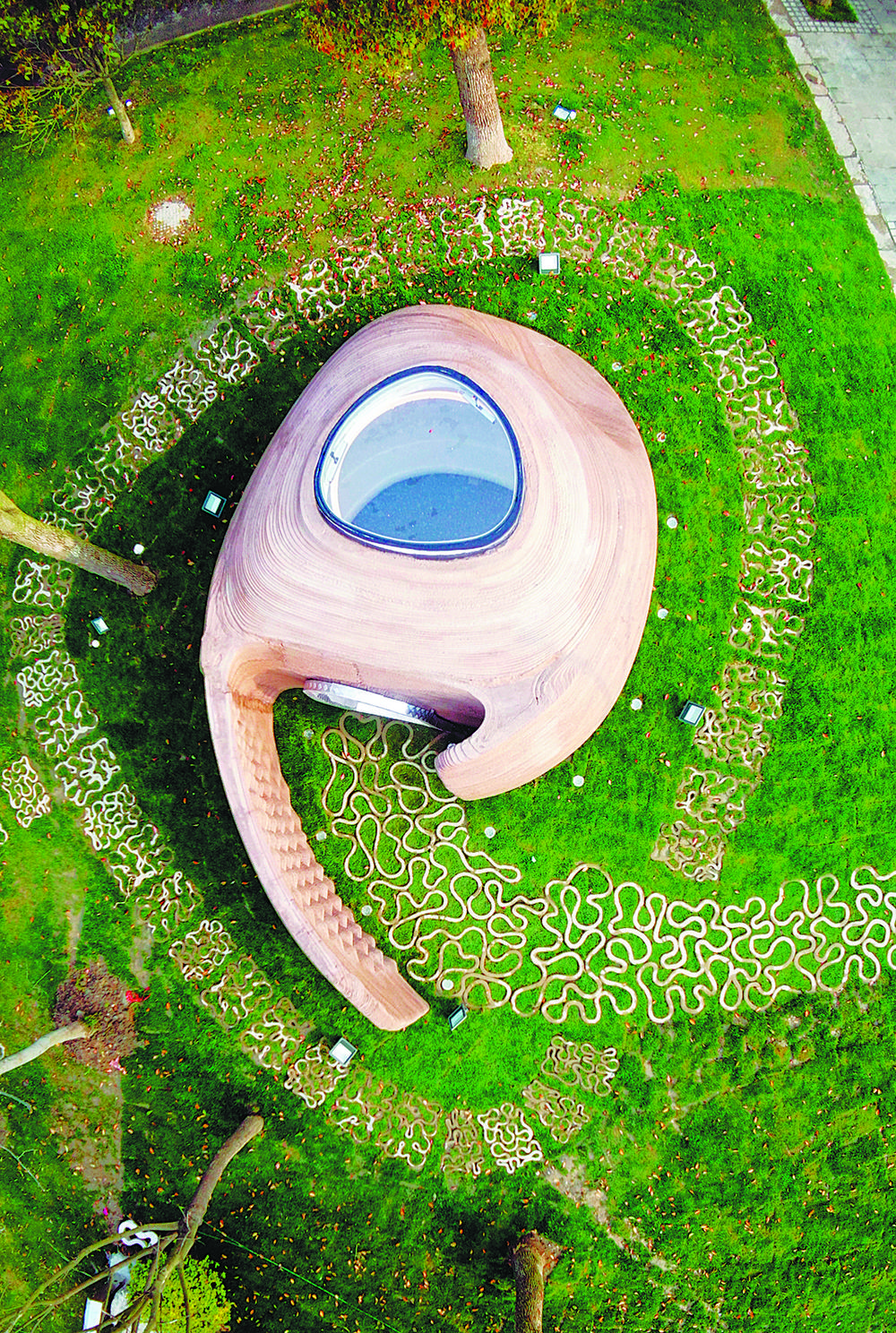 3月21日,上海市宝山区蕰川路智慧湾科创园内,全国首个采用混凝土3D打印而成的图书屋亮相。从外观看,该图书屋为“堡垒”形,呈棕色混凝土颜色,书屋周边铺设了3D打印地砖。