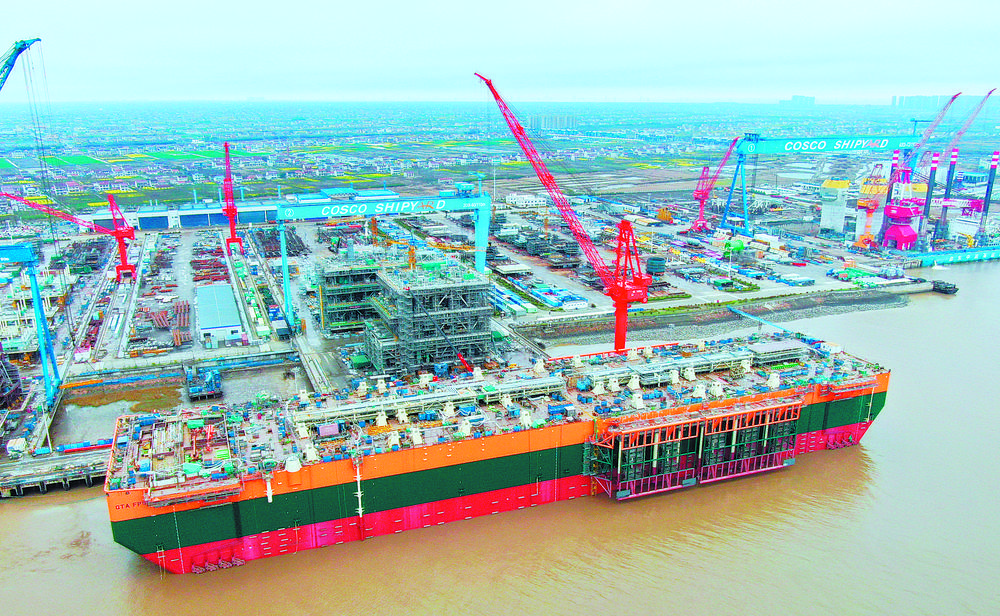 3月20日,由中远海运海洋工程有限公司承建的FPO(浮式生产储卸油船)停靠在江苏启东中远海工码头。该船船长270米,型宽54米,型深31米,是中国船企首次为非洲项目建造的浮式生产储卸油船。