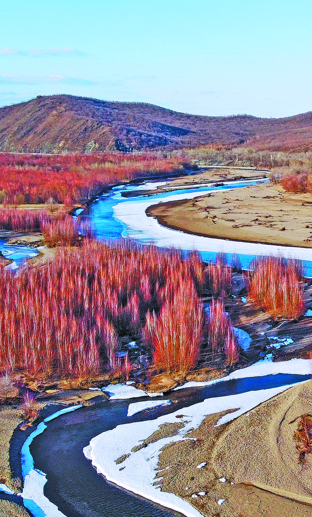 3月21日,内蒙古自治区扎兰屯市,雅鲁河红毛柳与融化的冰雪共同构成了一幅美丽的生态画卷。近年来,扎兰屯市扎实推进“绿色崛起、富民强市”战略,不断加大环境保护力度,昔日的河滩沙地种上了成片红柳林。 韩 冷摄(中经视觉)