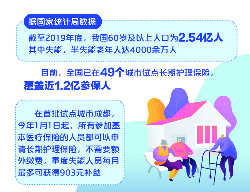 在首批试点城市成都,今年1月1日起,所有参加基本医疗保险的人员都可以申请长期护理保险,不需要额外缴费,重度失能人员每月最多可获得903元补助。事实上,目前全国已在49个城市试点长期护理保险,覆盖近1.2亿参保人。