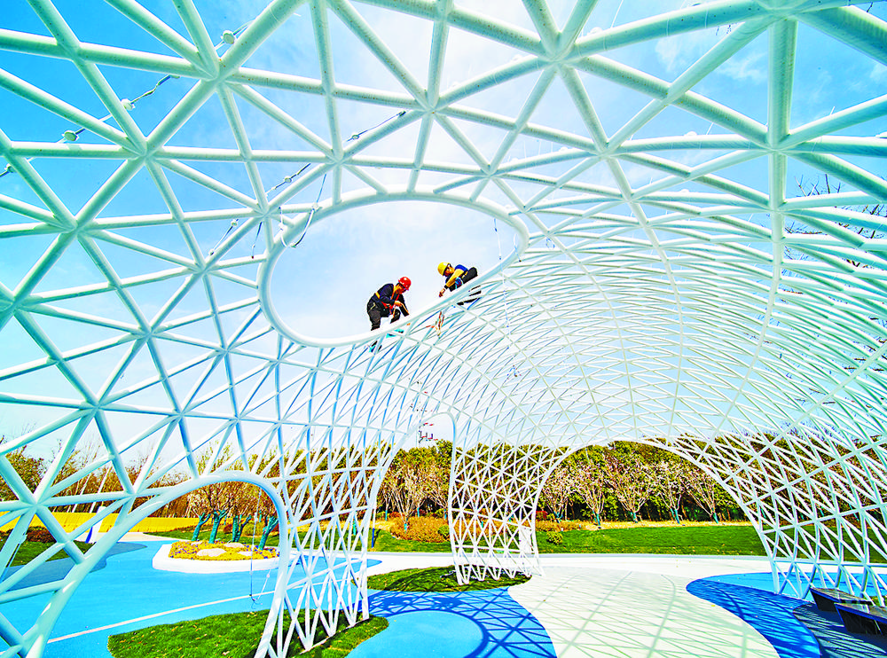 3月24日,江苏宿迁市酒都文化公园装饰廊道正进行亮化施工。宿迁市推进城市公园、绿地建设,实施大运河、古黄河、骆马湖沿线“一岸两线”绿道生态系统建设,形成了以水串城、清水绕城,水景交融、人水相依的滨水特色,出行300米即可步入绿色空间。陆启辉摄(中经视觉)