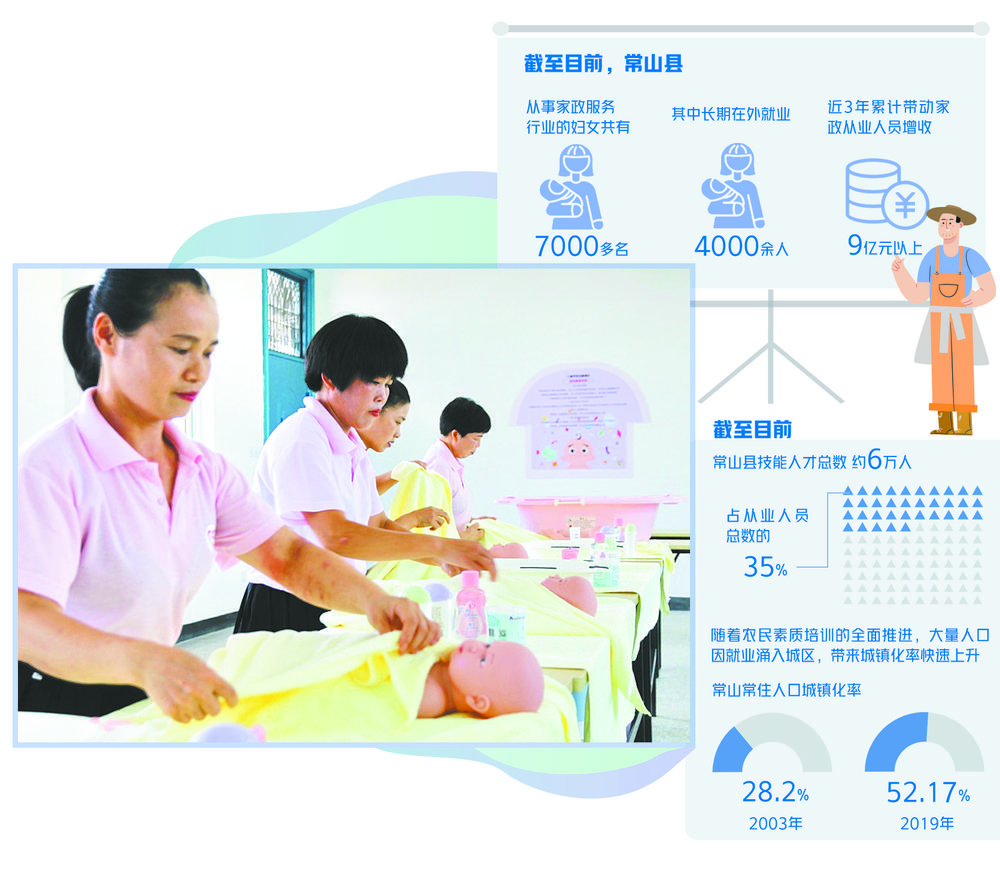 “常山阿姨”上岗证可谓是一块“金字招牌”。大桥头乡新村村民张根莲是一名月嫂,目前每月工资近1.5万元。可她刚入行时,每天只能拿90元工资。经过培训,张根莲成为经过认证的“常山阿姨”。“现在不仅还清了前几年为医治丈夫欠下的18万元债务,还为家人带来生活依靠。”张根莲说。