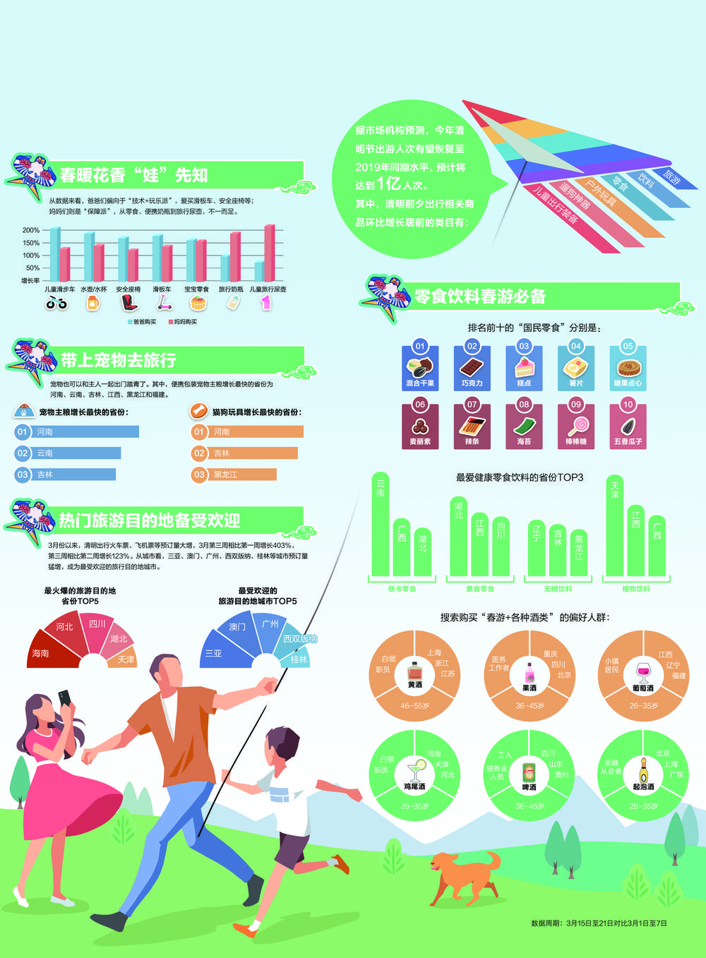春暖花开时节,“清明”“五一”纷至沓来。当前,全国新冠肺炎疫情防控效果显著,大众出游需求高涨,各地消费者纷纷启动早已规划好的春游踏青计划。借着这股“春风”,旅游消费不断升温,从“遛娃神器”到出游必备零食,再到火车票飞机票,与出行相关的各类商品备受关注。