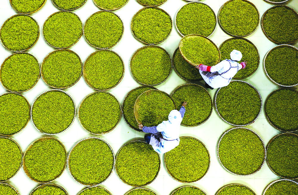 3月23日,在景宁畲族自治县一家茶叶加工企业,工人在摊青车间忙碌。