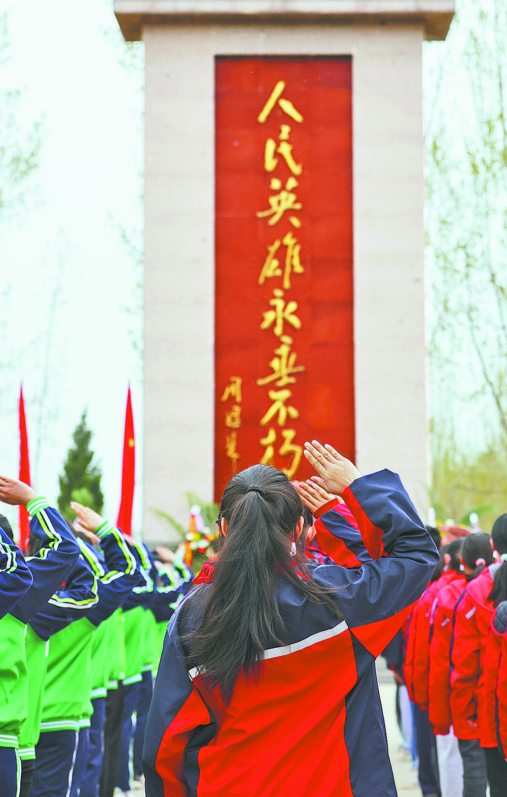 在庄严肃穆的革命烈士纪念碑前,干部群众为在战争中牺牲的革命烈士们默哀。随后,天津师范大学第二附属小学近百名少先队员齐声高唱《我们是共产主义接班人》,表达对革命先烈的崇敬与思念,更将“爱祖国,爱人民,为着理想勇敢前进”的誓言植入心底。