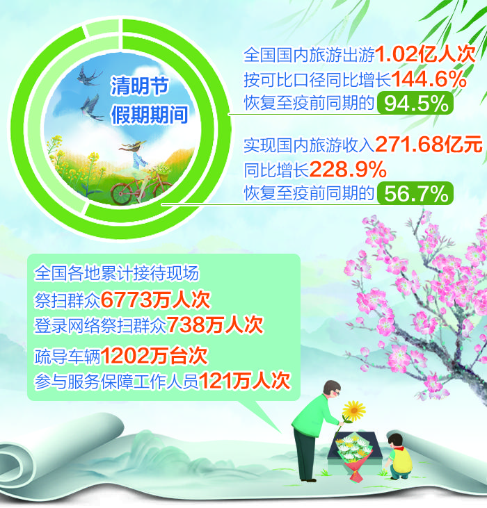 此外,据民政部清明节祭扫工作办公室统计,清明节假期各地累计接待现场祭扫群众6773万人次,登录网络祭扫群众738万人次,疏导车辆1202万台次,参与服务保障工作人员121万人次。