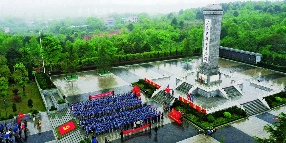 上图 4月2日,湖南省永州市零陵区烈士纪念园广场,永州市蘋洲小学师生、基干民兵在进行祭奠革命先烈仪式,表达对革命先烈的崇敬之情。潘爱民摄(中经视觉)
