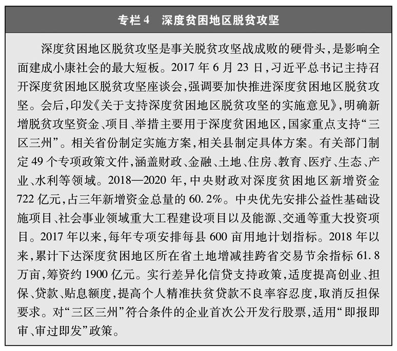 深度贫困地区是贫中之贫、坚中之坚。通过脱贫攻坚,“三区三州”(注⑨)等深度贫困地区突出问题得到根本解决,基础设施和公共服务水平显著提升,特色主导产业加快发展,社会文明程度明显提高,区域性整体贫困问题彻底解决(专栏4)。