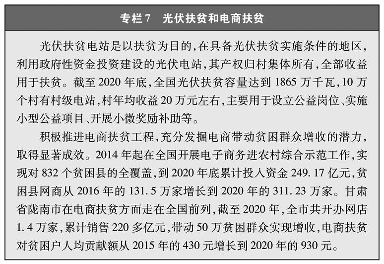 发展生产脱贫一批。发展产业是脱贫致富最直接、最有效的办法,也是增强贫困地区造血功能、帮助贫困群众就地就业的长远之计。支持和引导贫困地区因地制宜发展特色产业,鼓励支持电商扶贫、光伏扶贫、旅游扶贫等新业态新产业发展(专栏7),依托东西部扶贫协作推进食品加工、服装制造等劳动密集型产业梯度转移,一大批特色优势产业初具规模,增强了贫困地区经济发展动能。累计建成各类产业基地超过30万个,形成了特色鲜明、带贫面广的扶贫主导产业,打造特色农产品品牌1.2万个。发展市级以上龙头企业1.44万家、农民合作社71.9万家,72.6%的贫困户与新型农业经营主体建立了紧密型的利益联结关系。产业帮扶政策覆盖98.9%的贫困户,有劳动能力和意愿的贫困群众基本都参与到产业扶贫之中。扎实推进科技扶贫,建立科技帮扶结对7.7万个,选派科技特派员28.98万名,投入资金200多亿元,实施各级各类科技项目3.76万个,推广应用先进实用技术、新品种5万余项,支持贫困地区建成创新创业平台1290个。为贫困户提供扶贫小额信贷支持(专栏8),培育贫困村创业致富带头人,建立完善带贫机制,鼓励和带领贫困群众发展产业增收致富。
