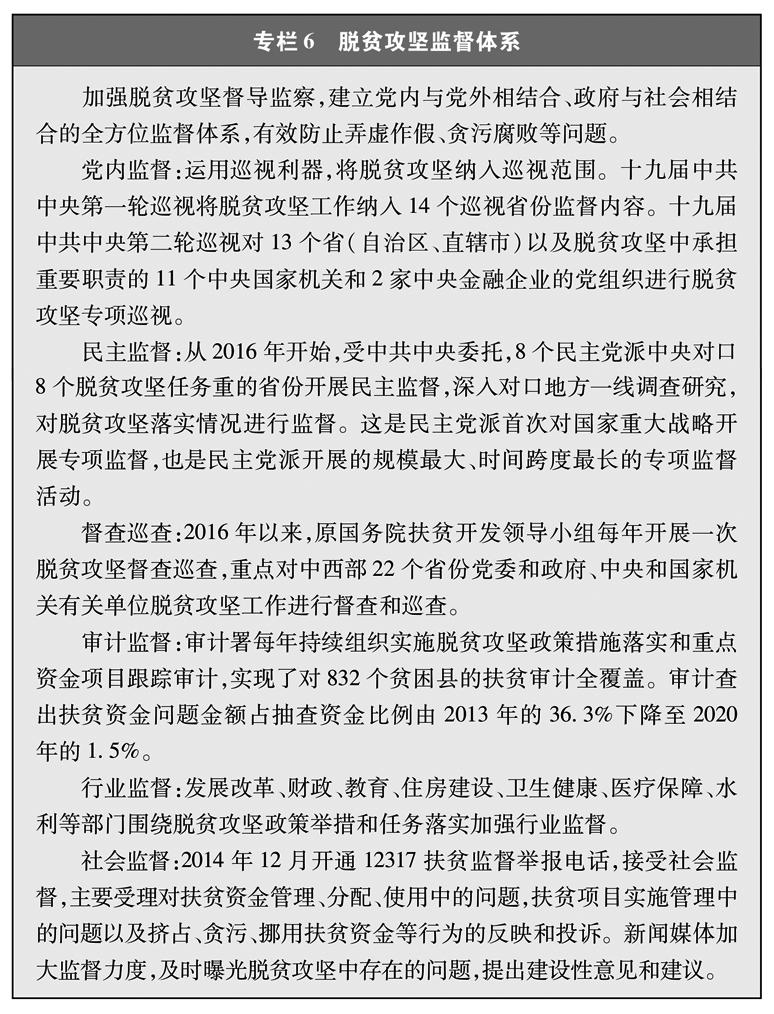 脱贫攻坚涉及面广、要素繁多、极其复杂,需要强有力的组织领导和贯彻执行。充分发挥党的政治优势、组织优势,建立中央统筹、省负总责、市县抓落实的脱贫攻坚管理体制和片为重点、工作到村、扶贫到户的工作机制,构建起横向到边、纵向到底的工作体系。各级党委充分发挥总揽全局、协调各方的作用,执行脱贫攻坚一把手负责制,中西部22个省份党政主要负责同志向中央签署责任书、立下军令状,省市县乡村五级书记一起抓。脱贫攻坚期内,贫困县党委政府正职保持稳定。有脱贫任务的地区,倒排工期、落实责任,抓紧施工、强力推进。脱贫攻坚任务重的地区,把脱贫攻坚作为头等大事和第一民生工程,以脱贫攻坚统揽经济社会发展全局。实行最严格的考核评估和监督检查,组织脱贫攻坚专项巡视,开展扶贫领域腐败和作风问题专项治理(专栏5),加强脱贫攻坚督导和监察(专栏6),确保扶贫工作务实、脱贫过程扎实、脱贫结果真实,使脱贫攻坚成果经得起实践和历史检验。建立健全干部担当作为的激励和保护机制,加大关心关爱干部力度,树立正确用人导向,引导广大干部在决胜脱贫攻坚中奋发有为、履职尽责。加强基层扶贫队伍建设,普遍建立干部驻村帮扶工作队制度,按照因村派人、精准选派的原则,选派政治素质好、工作能力强、作风实的干部驻村扶贫。广大驻村干部牢记使命、不负重托,心系贫困群众,扎根基层扶贫一线,倾心倾力帮助贫困群众找出路、谋发展、早脱贫。从2013年开始向贫困村选派第一书记和驻村工作队,到2015年,实现每个贫困村都有驻村工作队、每个贫困户都有帮扶责任人。截至2020年底,全国累计选派25.5万个驻村工作队、300多万名第一书记和驻村干部,同近200万名乡镇干部和数百万村干部一道奋战在扶贫一线。