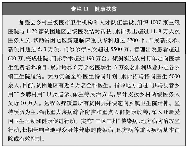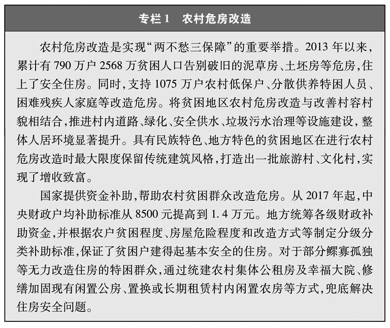 “两不愁三保障”全面实现。脱贫攻坚普查(注⑧)显示,贫困户全面实现不愁吃、不愁穿,平时吃得饱且能适当吃好,一年四季都有应季的换洗衣物和御寒被褥。贫困人口受教育的机会显著增多、水平持续提高,农村贫困家庭子女义务教育阶段辍学问题实现动态清零,2020年贫困县九年义务教育巩固率达到94.8%。持续完善县乡村三级医疗卫生服务体系,把贫困人口全部纳入基本医疗保险、大病保险、医疗救助三重制度保障范围,实施大病集中救治、慢病签约管理、重病兜底保障等措施,99.9%以上的贫困人口参加基本医疗保险,全面实现贫困人口看病有地方、有医生、有医疗保险制度保障,看病难、看病贵问题有效解决。实施农村危房改造,贫困人口全面实现住房安全有保障(专栏1)。实施农村饮水安全和巩固提升工程,累计解决2889万贫困人口的饮水安全问题,饮用水量和水质全部达标,3.82亿农村人口受益;贫困地区自来水普及率从2015年的70%提高到2020年的83%。