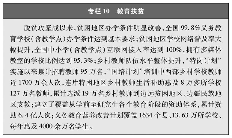发展教育脱贫一批。坚持再穷不能穷教育、再穷不能穷孩子,加强教育扶贫,不让孩子输在起跑线上,努力让每个孩子都有人生出彩的机会,阻断贫困代际传递(专栏10)。持续提升贫困地区学校、学位、师资、资助等保障能力,20多万名义务教育阶段的贫困家庭辍学学生全部返校就读,全面实现适龄少年儿童义务教育有保障。实施定向招生、学生就业、职教脱贫等倾斜政策,帮助800多万贫困家庭初高中毕业生接受职业教育培训、514万名贫困家庭学生接受高等教育,重点高校定向招收农村和贫困地区学生70多万人,拓宽贫困学生纵向流动渠道。开展民族地区农村教师和青壮年农牧民国家通用语言文字培训,累计培训350万余人次,提升民族地区贫困人口就业能力。“学前学会普通话”行动先后在四川省凉山彝族自治州和乐山市马边彝族自治县、峨边彝族自治县、金口河区开展试点,覆盖43万学龄前儿童,帮助他们学会普通话。