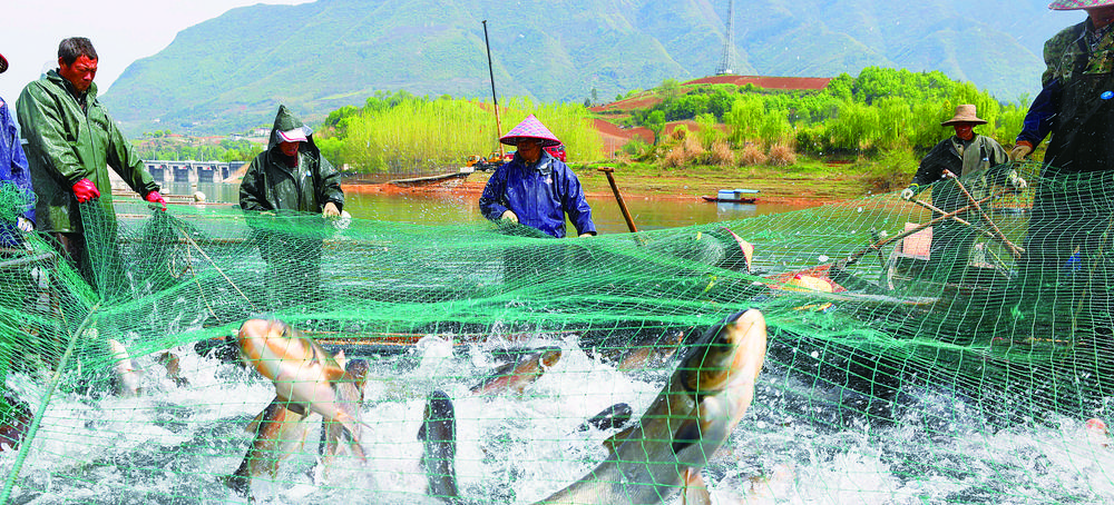 4月6日,湖北省保康县寺坪镇南河渔业农民专业合作社渔民在收网捕鱼。近年来,该合作社探索立体生态深水养鱼模式,带动社员增收。陈泉霖摄(中经视觉)