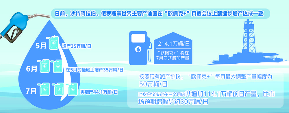 日前,沙特阿拉伯、俄罗斯等世界主要产油国在“欧佩克+”月度会议上就逐步增产达成一致,决定在5月增产35万桶/日,6月在此基础上增产35万桶/日,7月再增产44.1万桶/日,除此之外,沙特阿拉伯还将在7月之前逐步退出现有的100万桶/日的额外主动减产计划,其中5月增产25万桶/日,6月增产35万桶/日,7月增产40万桶/日。按此计划,“欧佩克+”将在7月总共增加214.1万桶/日的产量,沙特能源大臣阿卜杜勒阿齐兹表示,分阶段增产给予“欧佩克+”足够的灵活性,各主要产油国将继续密切关注市场动态,能源部长们将在4月28日再次开会,讨论是否需要对现有计划进行调整。
