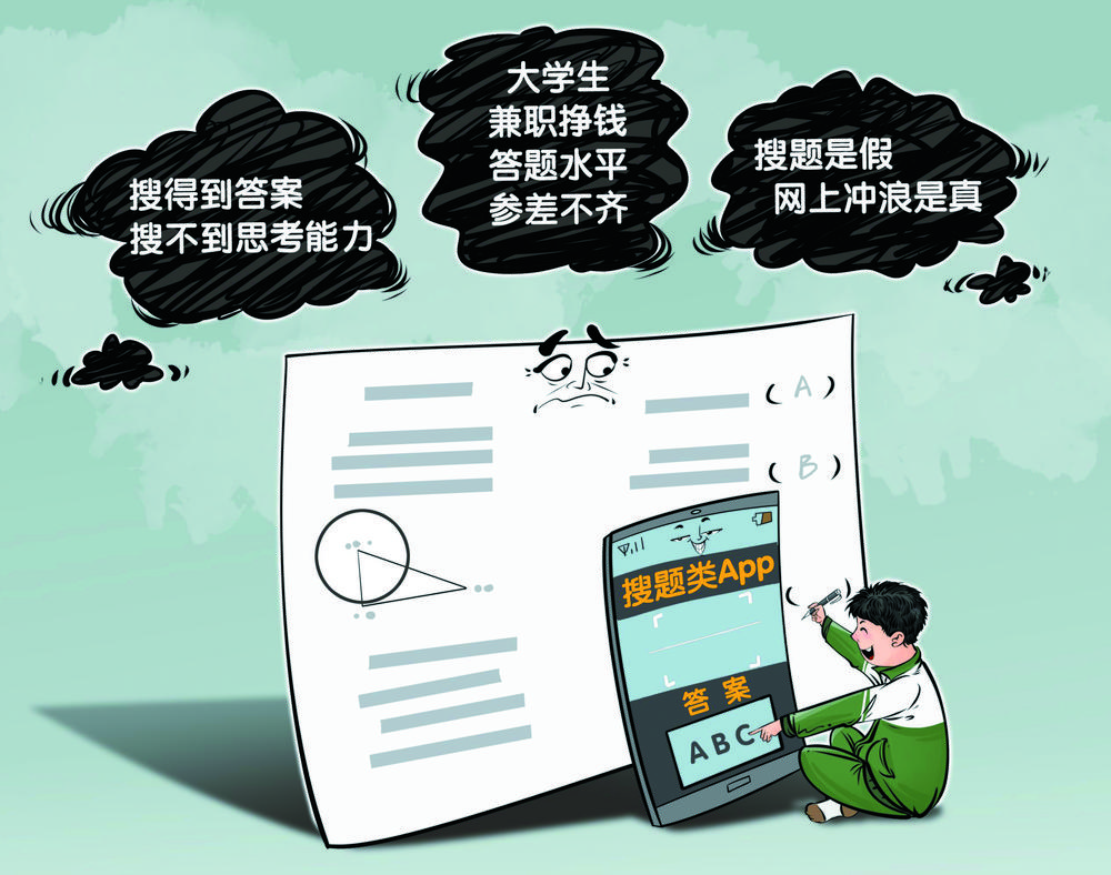 近年来,不少在线教育平台推出拍照搜题App,宣称“手机一拍,答案就来”,使得不少学生群体对其产生依赖,一些自制力比较差的学生可能直接对着搜题App抄袭答案。搜题App的市场乱象,亟待引起有关方面的关注,对这一领域必须加强监管。(时 锋)
