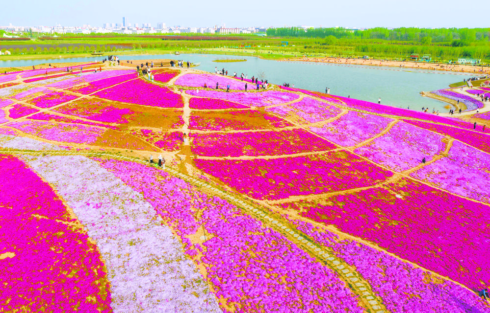 4月10日,游人在安徽省亳州市华佗百草园景区芝樱花花海中游览。近日,亳州市华佗百草园景区的芝樱花竞相开放,美不胜收,吸引众多游客前来观赏。刘勤利摄(中经视觉)