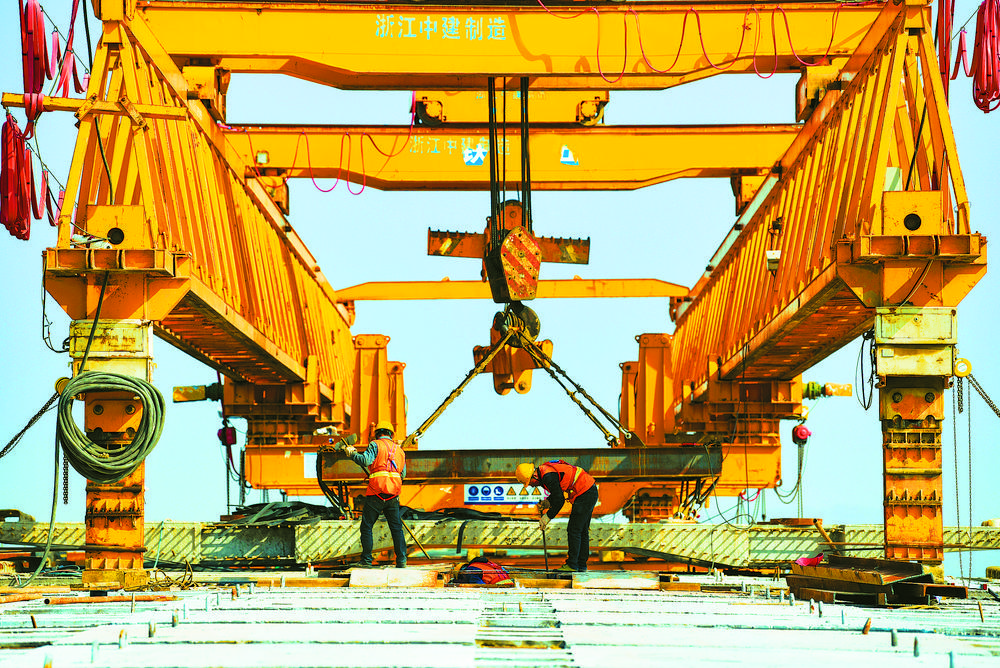 4月11日,工人在乌玛高速公路镇罗黄河特大桥上施工。当日,由中国中铁五局承建的乌玛(内蒙古乌海市至青海玛沁县)高速公路(宁夏境)青铜峡至中卫段控制性工程——镇罗黄河特大桥顺利合龙,标志着该桥主体工程基本完成,为年底乌玛高速公路青铜峡至中卫段建成通车打下基础。镇罗黄河特大桥全长1289米,桥宽26米,是衔接乌玛高速公路和定武高速公路联络线的主要通道,同时也是全线的重点控制性工程。 新华社记者 冯开华摄