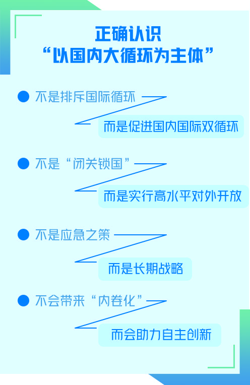 第三,以国内大循环为主体并非应急之策,而是适应经济发展阶段变化的长期战略。过去,我国主要依靠外延式增长打造完整产业体系,使经济规模迅速扩大;发展到今天,必须依靠内涵式增长,通过全要素生产率的提升实现经济高质量发展。从长期来看,以国内大循环为主体,贯彻新发展理念,是实现经济高质量发展的重要手段。进入新发展阶段,科技创新和制度优化将越来越成为经济增长的重要动力;生态环境将持续改善,经济发展不再以牺牲资源环境为代价,节能环保产业成为支柱型产业之一,绿色消费成为内需市场的重要组成部分。同时,还会通过深化收入分配制度改革,推动形成合理有序的收入分配格局,让改革发展成果更多更公平地惠及全体人民,为保持经济长期稳定发展夯实重要基础。