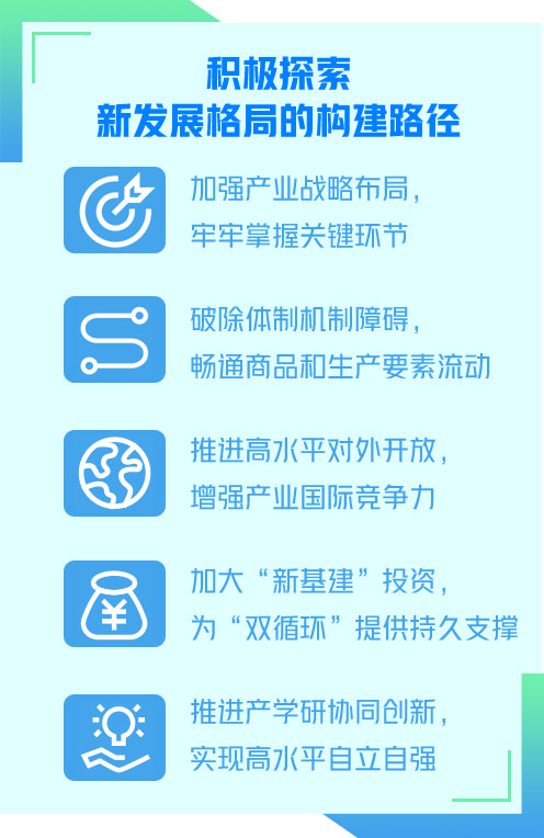 加快构建以国内大循环为主体、国内国际双循环相互促进的新发展格局,应着力加强产业战略布局、畅通商品和生产要素流动、推进高水平对外开放、加大“新基建”投资、推进产学研协同创新,积极探索有效路径。