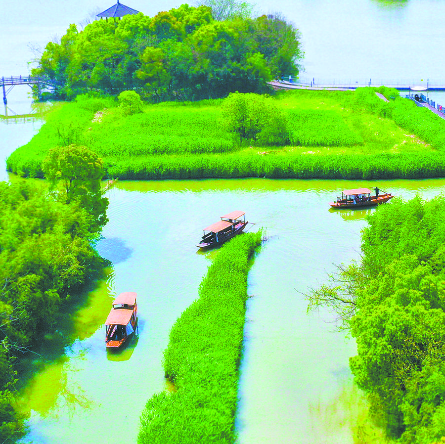 4月5日,浙江省德清县下渚湖国家湿地公园,游客乘坐摇橹船欣赏春景。近年来,德清县依托山水资源和良好的生态环境,乡村生态旅游发展得红红火火,产品业态丰富、富民增收效益提升。王 正摄(中经视觉)