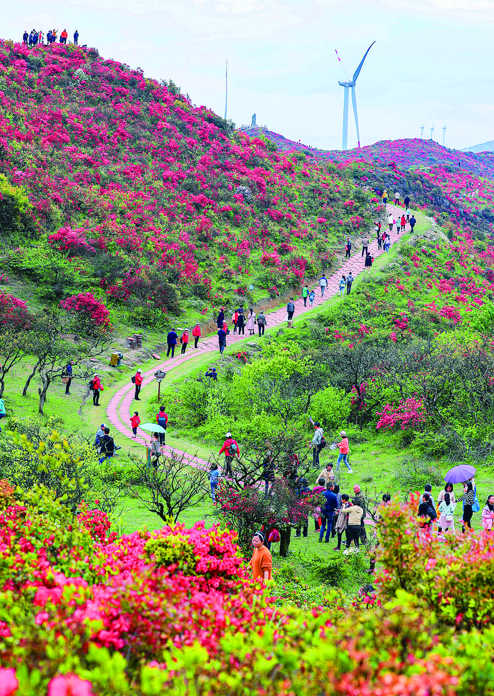 4月13日,游客在江西省广昌县牙梳山景区游览。连日来,牙梳山上杜鹃花竞相绽放,吸引了大批游客前来体验生态游。曾恒贵摄(中经视觉)