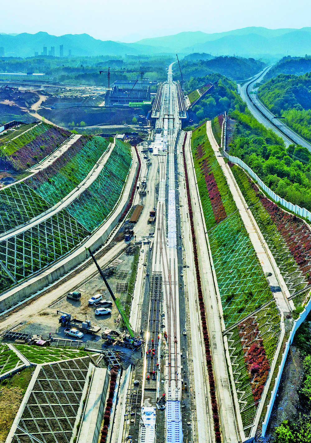 这是4月12日在郑万高铁南漳站拍摄的中铁十一局无砟轨道施工现场(无人机照片)。目前,经过中铁十一局等参建单位建设者艰苦奋战,郑万高铁湖北段进入无砟轨道施工冲刺。郑万高铁全长818公里,设计时速350公里,起于郑州南站,经过湖北、重庆,终到万州北站。新华社记者 杜华举摄