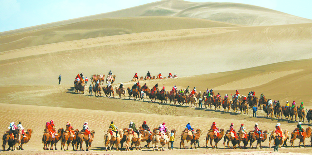 近日,游客在甘肃省敦煌市鸣沙山月牙泉景区游览。