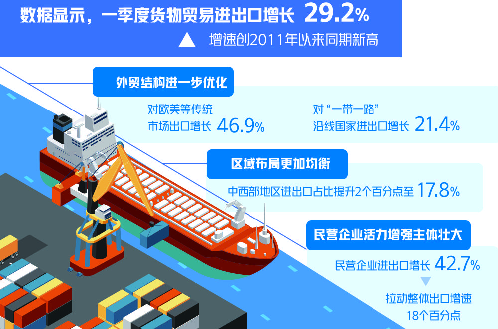 数据显示,一季度货物贸易进出口增长29.2%,增速创2011年以来同期新高。与2019年同期相比,进出口、出口、进口分别增长20.5%、22.5%和18.2%,也处于较高水平。