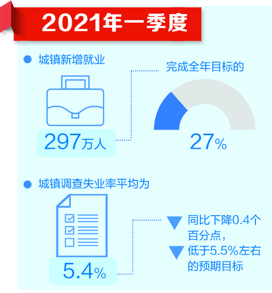 人力资源和社会保障部数据显示,1月份至3月份城镇新增就业297万人,完成全年目标的27%;城镇失业人员再就业103万人,就业困难人员就业37万人,均保持较高水平。此外,人力资源市场供求保持平稳,一季度全国人力资源市场求人倍率为1.60,比上年四季度上升0.08,招聘岗位数量继续大于求职人数。