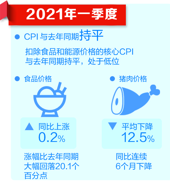 CPI同比逐月回升。一季度,CPI与去年同期持平,扣除食品和能源价格的核心CPI与去年同期持平,处于低位。分月看,受去年同期对比基数由高走低影响,1月份、2月份同比分别下降0.3%和0.2%,3月份转为上涨0.4%。