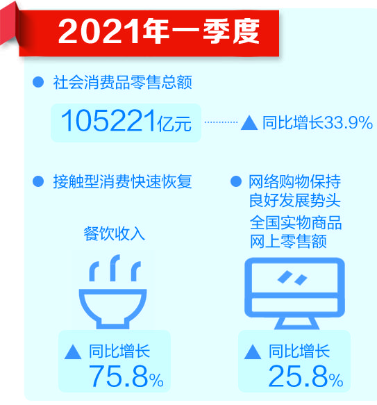 一季度,新冠肺炎疫情防控与经济社会发展成果持续显现。消费市场延续上年逐季恢复态势,市场销售持续改善。特别是3月份,消费市场加快复苏,餐饮等接触式消费明显改善,实体零售店铺经营继续回升。
