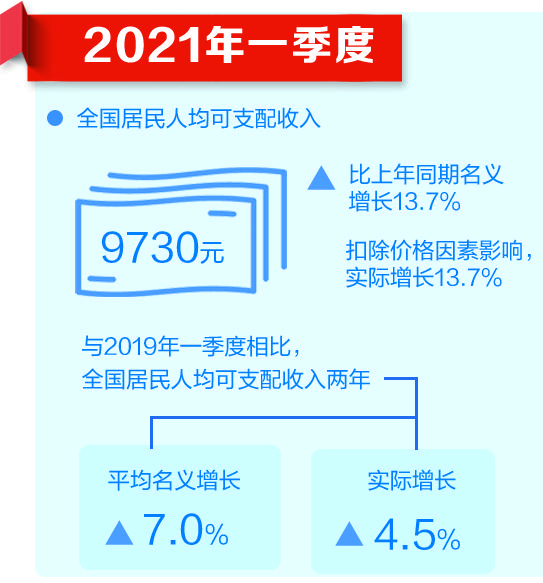 一季度,全国居民人均可支配收入9730元,比上年同期名义增长13.7%;扣除价格因素影响,实际增长13.7%。与2019年一季度相比,全国居民人均可支配收入两年平均名义增长7.0%,实际增长4.5%。一季度全国居民人均可支配收入延续上年同期以来增速逐季走高的趋势,保持稳定恢复性增长。