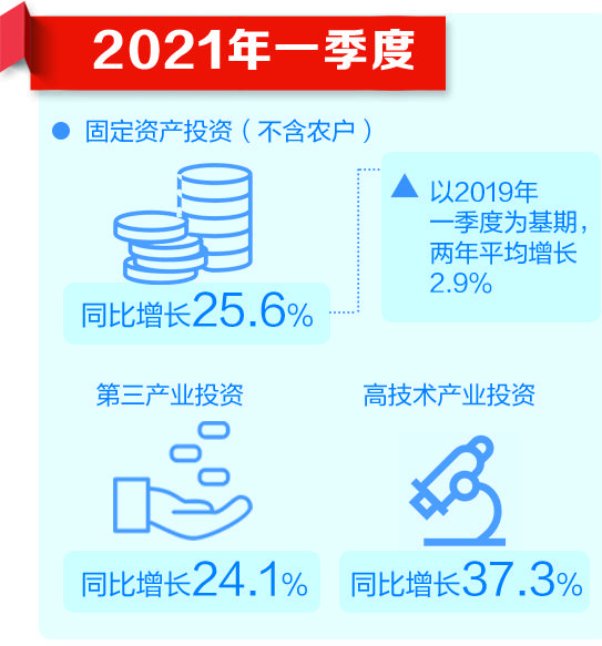 一季度,各地各部门进一步发挥投资关键作用,投资稳定恢复,结构优化向好。一季度,固定资产投资(不含农户)同比增长25.6%,以2019年一季度为基期,两年平均增长2.9%;与上年四季度环比增长2.06%。