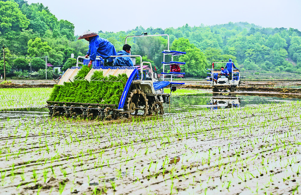 4月15日,村民在田间进行机插早稻作业。当日,湖南省永州市早稻生产暨机耕机插(抛)秧现场演示会在零陵区石山脚办事处悟山里村召开。活动现场,来自14个县区的种粮大户、农机合作社工作人员通过观摩学习工厂化育秧、机械化插秧、植保无人机施肥等演示,提高种粮能力。潘爱民摄(中经视觉)