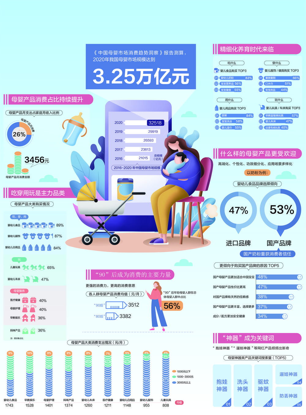 舍得花钱、精细养育、追求潮流……新一代宝妈宝爸的育儿理念不断更新,母婴消费需求持续升级,这些因素助力我国母婴市场规模快速增长。什么样的母婴产品更受欢迎?哪些人是母婴消费主要力量?母婴市场又将如何发展?让我们一起看看大数据怎么“说”。