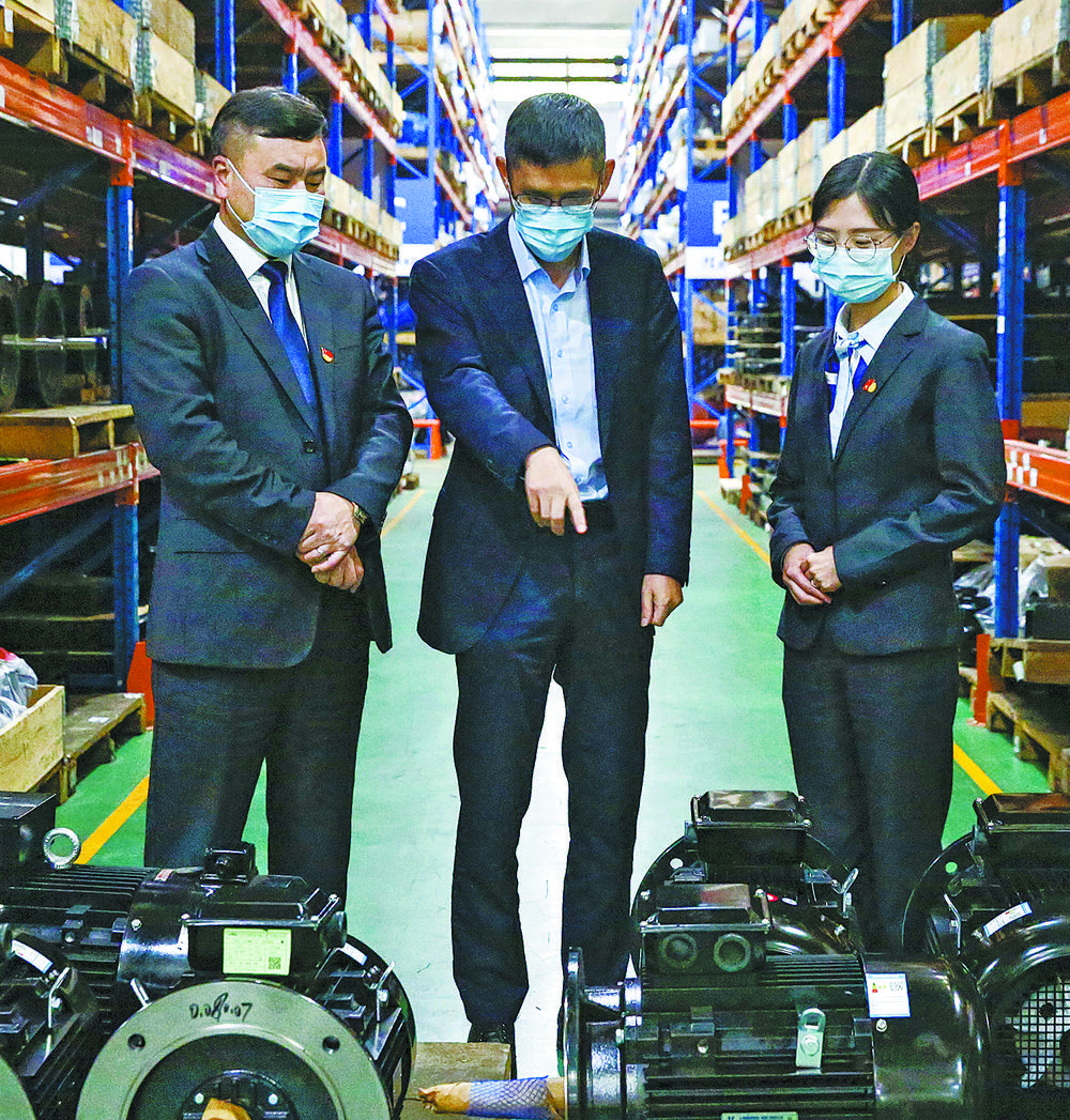 近日,建设银行温州分行工作人员(左一,右一)来到浙江省温州市永嘉县凯泉集团实地了解企业产品生产经营和销售情况。今年以来,该行在当地监管部门指导下,已发放民营企业贷款近30亿元,其中新增贷款16亿元,精准有力支持民营经济发展,助力温州创建全国民营经济示范城市。