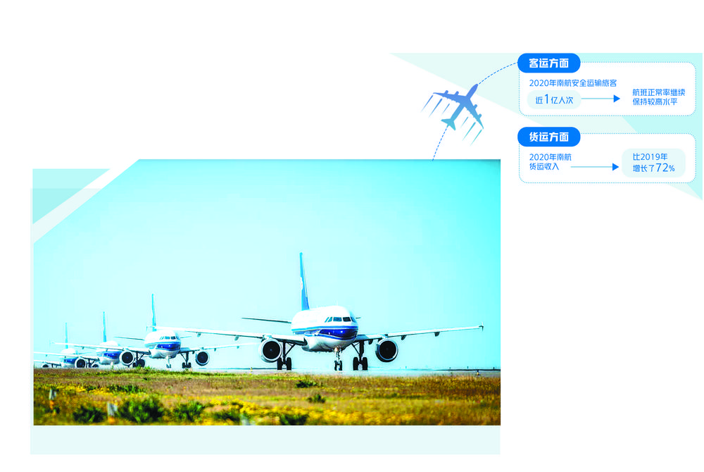 随着国内疫情防控形势逐步平稳,国内旅客运输量、航班量也加速回升,民航客运市场逐步回暖。在客运方面,2020年南航安全运输旅客近1亿人次,航班正常率连续5年在三大国有航空公司中排名第一;货运方面,2020年南航货运收入比2019年增长了72%。
