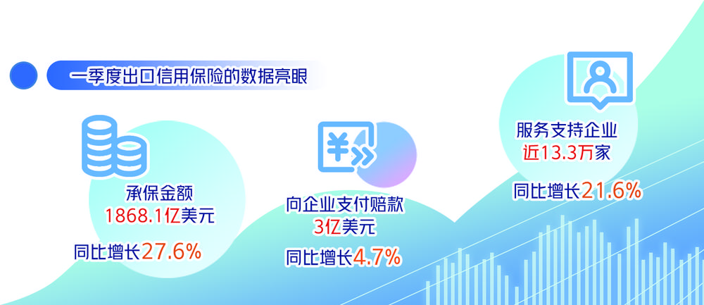 和一季度外贸一样,出口信用保险的数据同样亮眼。一季度承保金额达1868.1亿美元,同比增长27.6%;向企业支付赔款3亿美元,同比增长4.7%;服务支持企业近13.3万家,同比增长21.6%。