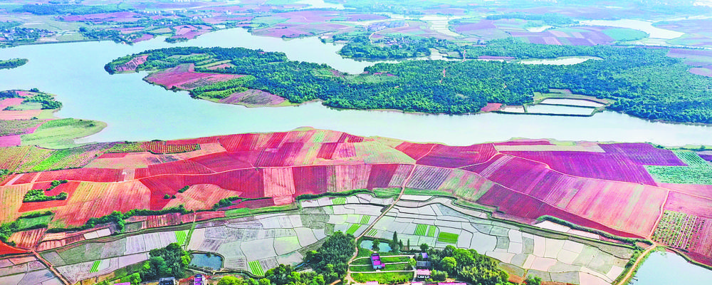 暮春时节,樟树市义成镇2.8万亩红土地里种上了成片的经济作物。红色的土地、湛蓝的湖水和绿油油的药材苗木,构成了一幅壮美的乡村新画卷。