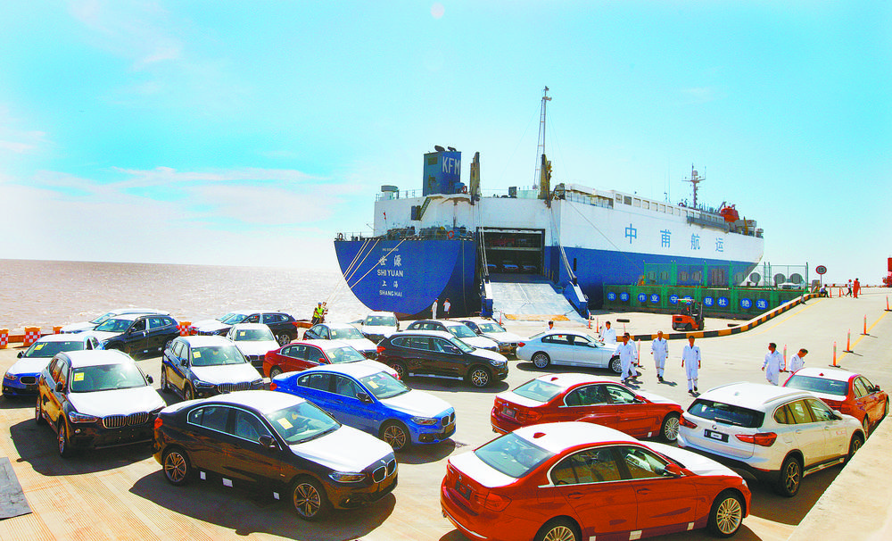 图③ 2013年9月上海自贸区发布中国首份外商投资准入负面清单。图为在位于上海临港新城的自贸区滚装码头上,工作人员将车辆开到码头停车场。新华社记者 方 喆摄