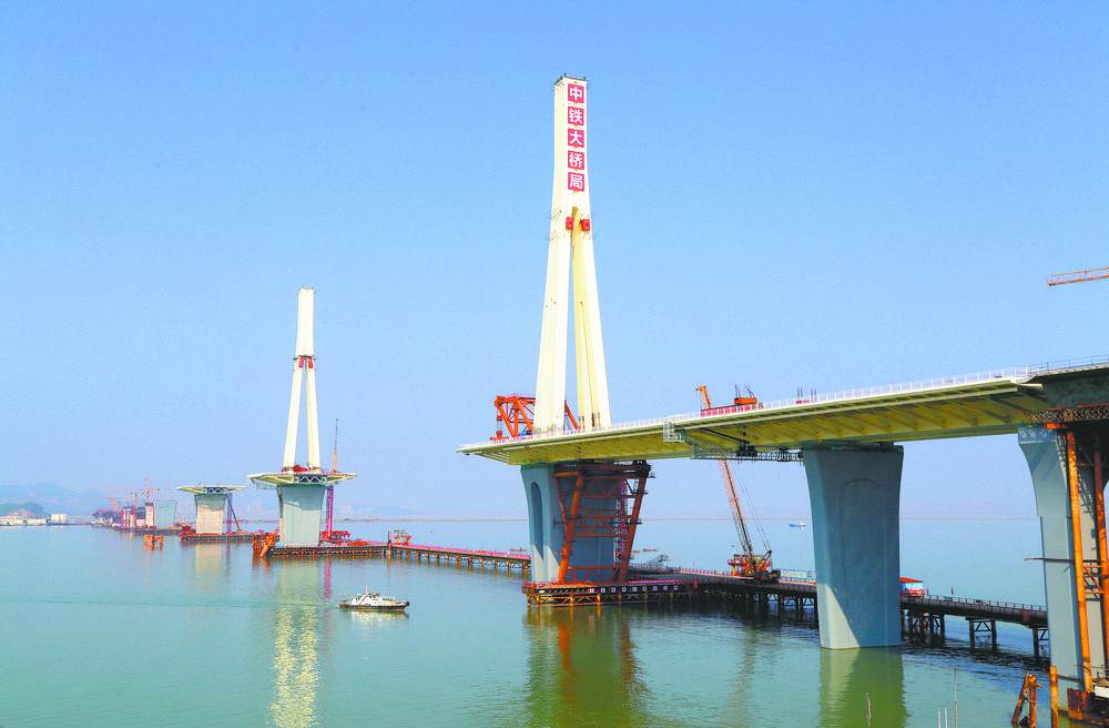 4月26日,由中铁大桥局承建的珠机城际金海大桥建设现场。大桥于2018年4月开工,全桥钢梁制造已完成70%以上,预计2023年正式建成通车。 大桥起自珠海横琴新区,跨越西江磨刀门水道,终至珠海机场东路,建成后,将成为珠三角地区联系澳门和香港的重要客运通道及珠海横琴新区对外重要交通枢纽。孟庆虎摄(中经视觉)