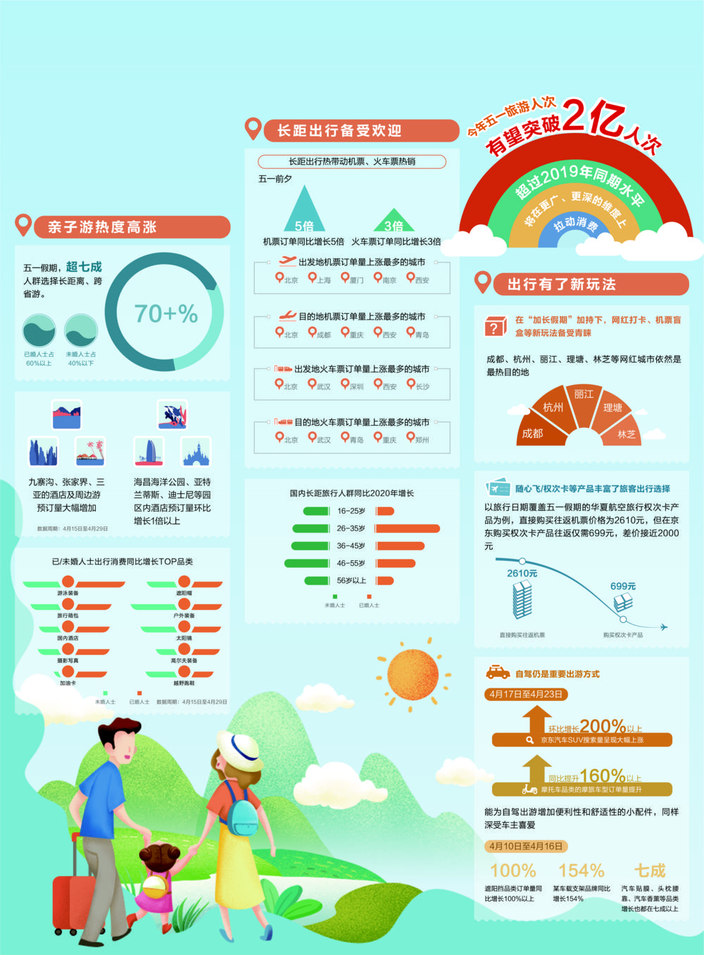 随着新冠肺炎疫情防控形势持续向好及利好政策的释放,2021年一季度旅游经济运行好于预期。今年五一假期旅游人次有望突破2019年同期水平,超过2亿人次,创五一假期新高。