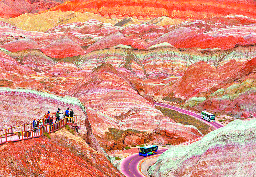 5月1日,在甘肃张掖七彩丹霞景区,各地游客纷至沓来,欣赏独特的丹霞地貌,领略西北壮美景色。该景区管委会统计,“五一”假期首日游客超1.2万人。