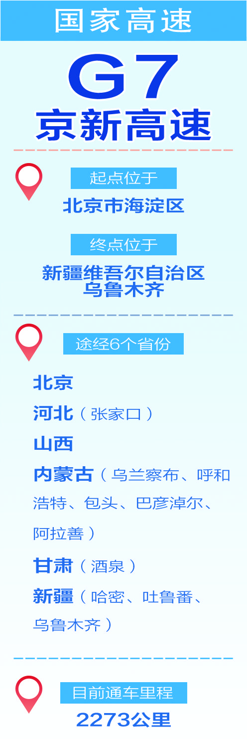 2017年,京新高速甘肃段、新疆段建成通车。今年内,预计贯穿北京、河北、山西、内蒙古、甘肃、新疆6省份的京新高速将基本全线贯通,成为新疆连接华北、东北及内地东部地区最便捷的公路通道。