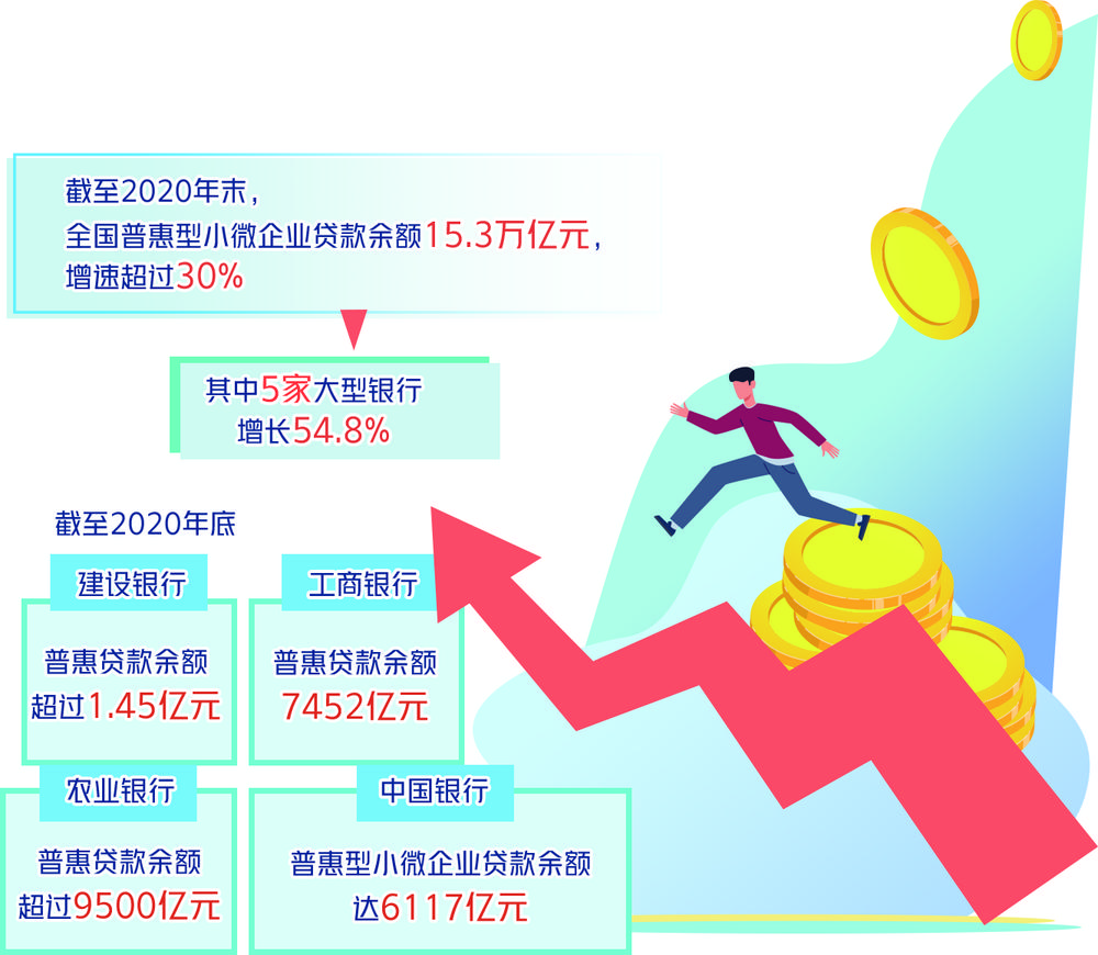 《通知》提出,普惠型小微企业贷款全年要继续实现增速、户数“两增”的目标,其中5家大型银行要努力实现普惠型小微企业贷款全年增长30%以上。银保监会统计数据显示,普惠型小微企业贷款已连续3年实现高速增长,截至2020年末,全国普惠型小微企业贷款余额15.3万亿元,增速超过30%,其中5家大型银行增长54.8%。