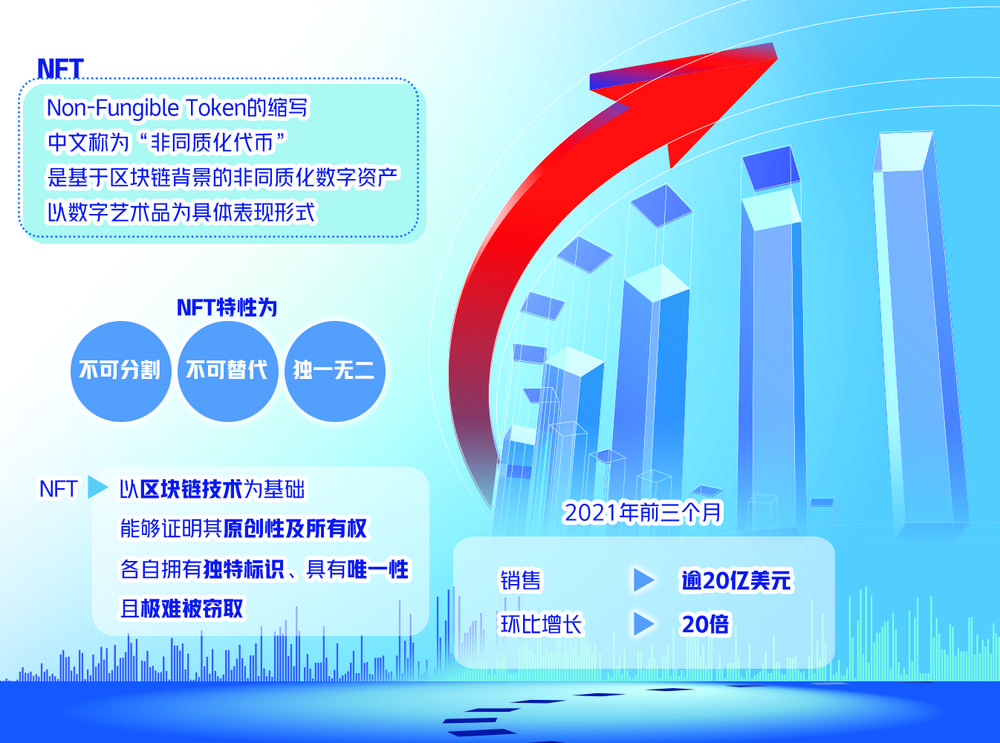 NFT是Non-Fungible Token的缩写,中文称为“非同质化代币”,是基于区块链背景的非同质化数字资产,与比特币、以太币相似又有所区别。它不可分割、不可替代、独一无二。NFT以区块链技术为基础,能够证明其原创性及所有权,各自拥有独特标识、具有唯一性,且极难被窃取。以数字艺术品为具体表现形式的NFT因此得到市场青睐。