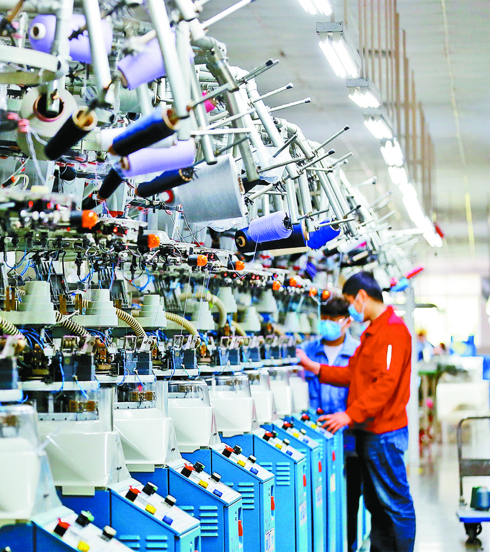 5月5日,在山东青岛市即墨区的青岛华盛袜业有限公司生产车间,制袜工人在生产出口产品。近年来,即墨区依托传统纺织服装产业优势,持续鼓励企业加速科技创新,推动工业互联网改造,提升自主品牌竞争力,企业迎来产销两旺的良好态势。 梁孝鹏摄(新华社发)